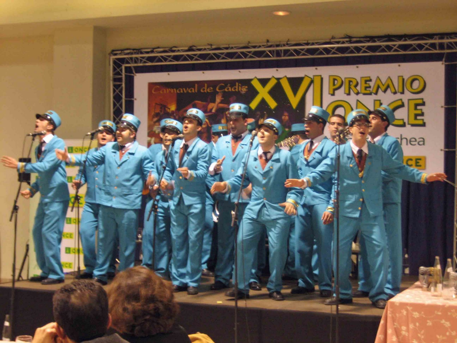 La noche comenzó con la actuación de la chirigota Clínica Dental Nuestra Señora de las Angustias y de los Dolores de Boca, de Cádiz, cuya letra ‘Dónde estás, Ay, Dónde estás’, de Antonio Pedro Serrano, obtuvo el tercer premio de esta edición de los Fermín Salvochea. Considerada como una de las punteras del Carnaval, son ya un grupo y autores reincidentes en los premios de la ONCE ya que han obtenido un tercer premio y un segundo en otras ediciones. Además, el autor de la música, Tino Tovar, obtuvo también el primer premio en 2000. La letra ganadora estaba dedicada a los accidentes de tráfico, una denuncia sobre este problema social enfocado en las propias carnes de que a diario se juega su vida en el asfalto. Entregó el premio -1.000 euros y trofeo- el delegado territorial de la ONCE en Andalucía, Patricio Cárceles.