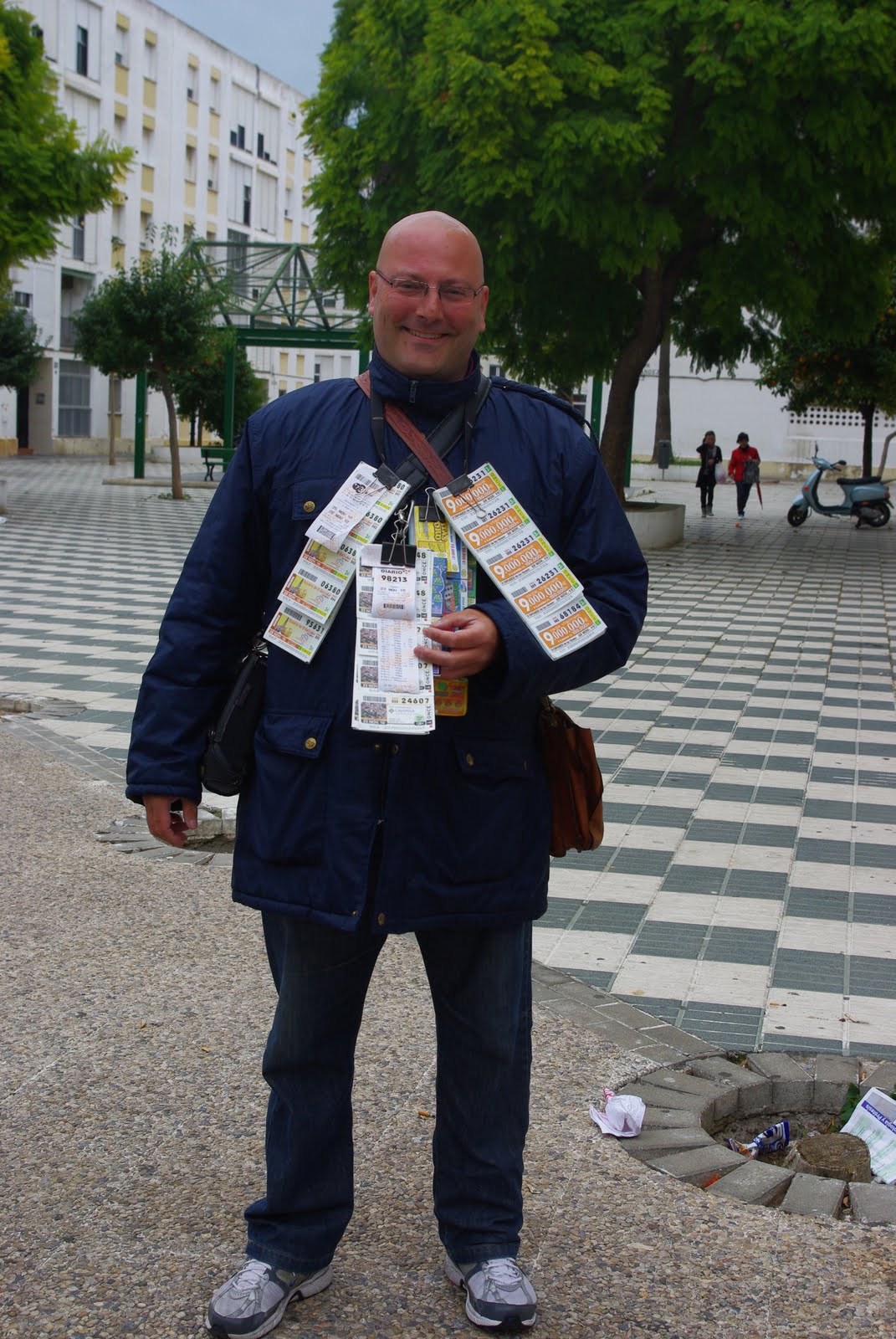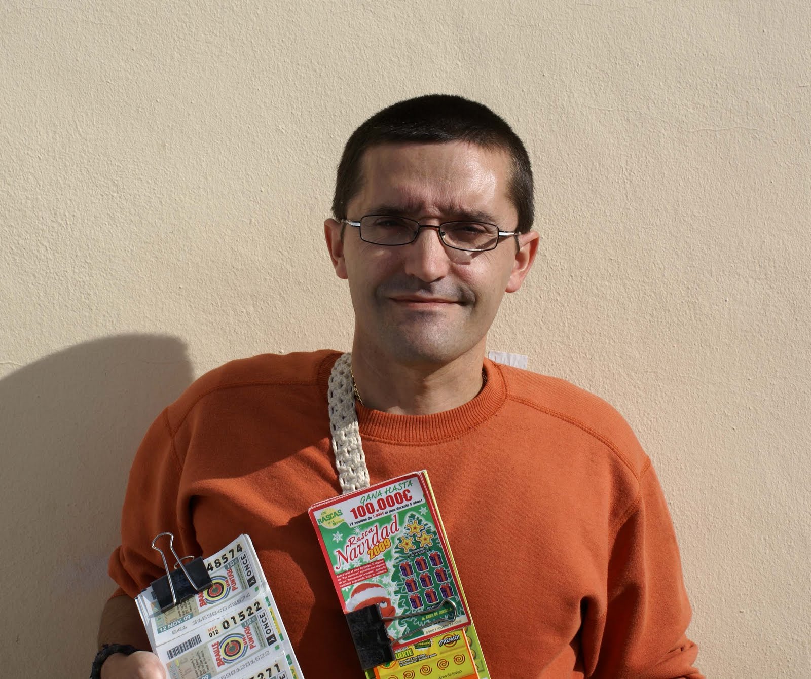 Juan José Marruecos Vázquez, 51 años, vendedor desde 1981, deficiente visual, vende en la calle Hermanos Pinzón de la capital almeriense, su localidad natal. , y acaba de recibir el reconocimiento de la ONCE por su trabajo en Almería. “El éxito está en echar muchas horas, tener mucha paciencia y tener siempre una sonrisa para los clientes”. “Es TPV una herramienta de trabajo estupenda –añade- todavía hay clientes reacios pero cada vez más los hay que les jugar con un número determinado”.