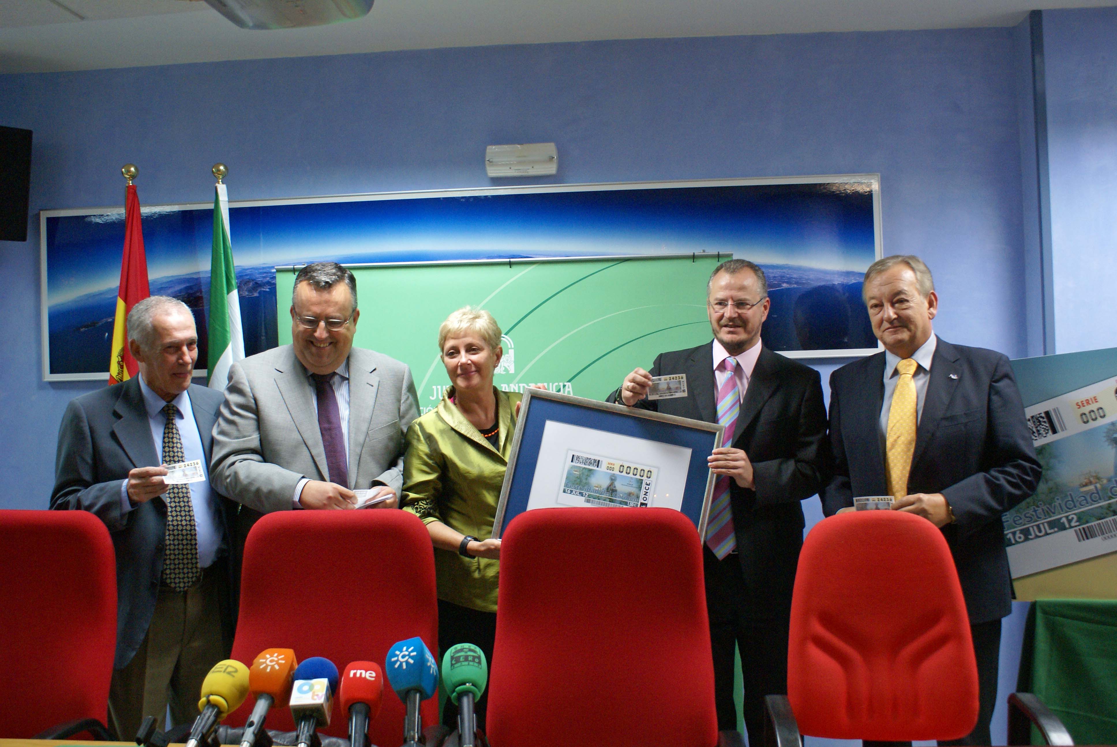 Los representantes del sector pesquero, la Junta de Andalucía y la ONCE muestran sonrientes el cupón de los pescadores