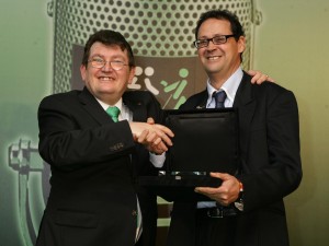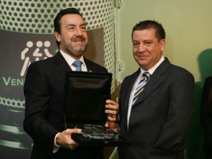 El presidente de la ONCE, Miguel Carballeda, entrega el premio al mejor vendedor del año en Granada, Antonio López Castellano. Reportaje gráfico: Javier Regueros