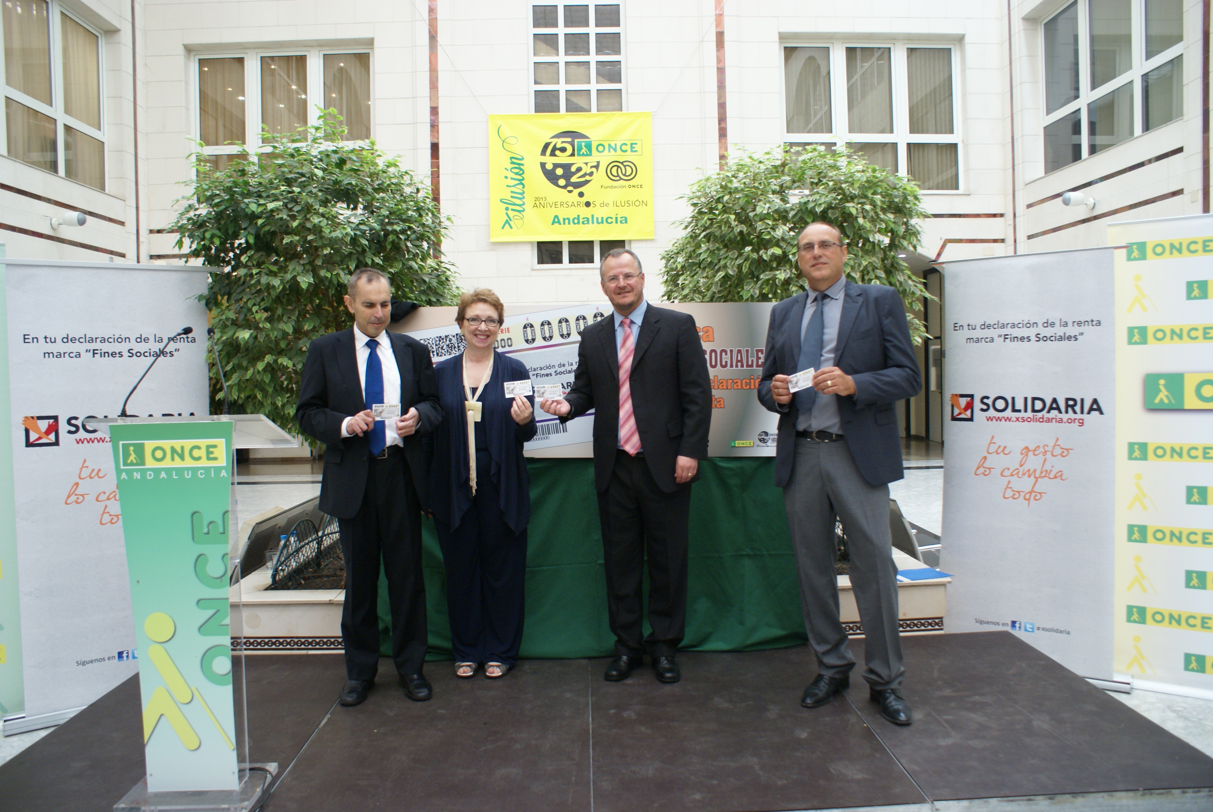 La ONCE dedicó el cupón del lunes 17 de junio a la casilla de Fines Sociales de la Declaración de la Renta. La consejera de Hacienda y Administración Pública, Carmen Martínez Aguayo, el delegado territorial de la ONCE en Andalucía, Ceuta y Melilla, Patricio Cárceles, el presidente del Consejo Territorial, Ventura Pazos, y el presidente de la Mesa del Tercer Sector, Manuel Sánchez, presentaron el pasado jueves 6 en la Delegación Territorial de la ONCE la imagen del cupón con el que la Organización quiere marcar la ‘X’ solidaria.