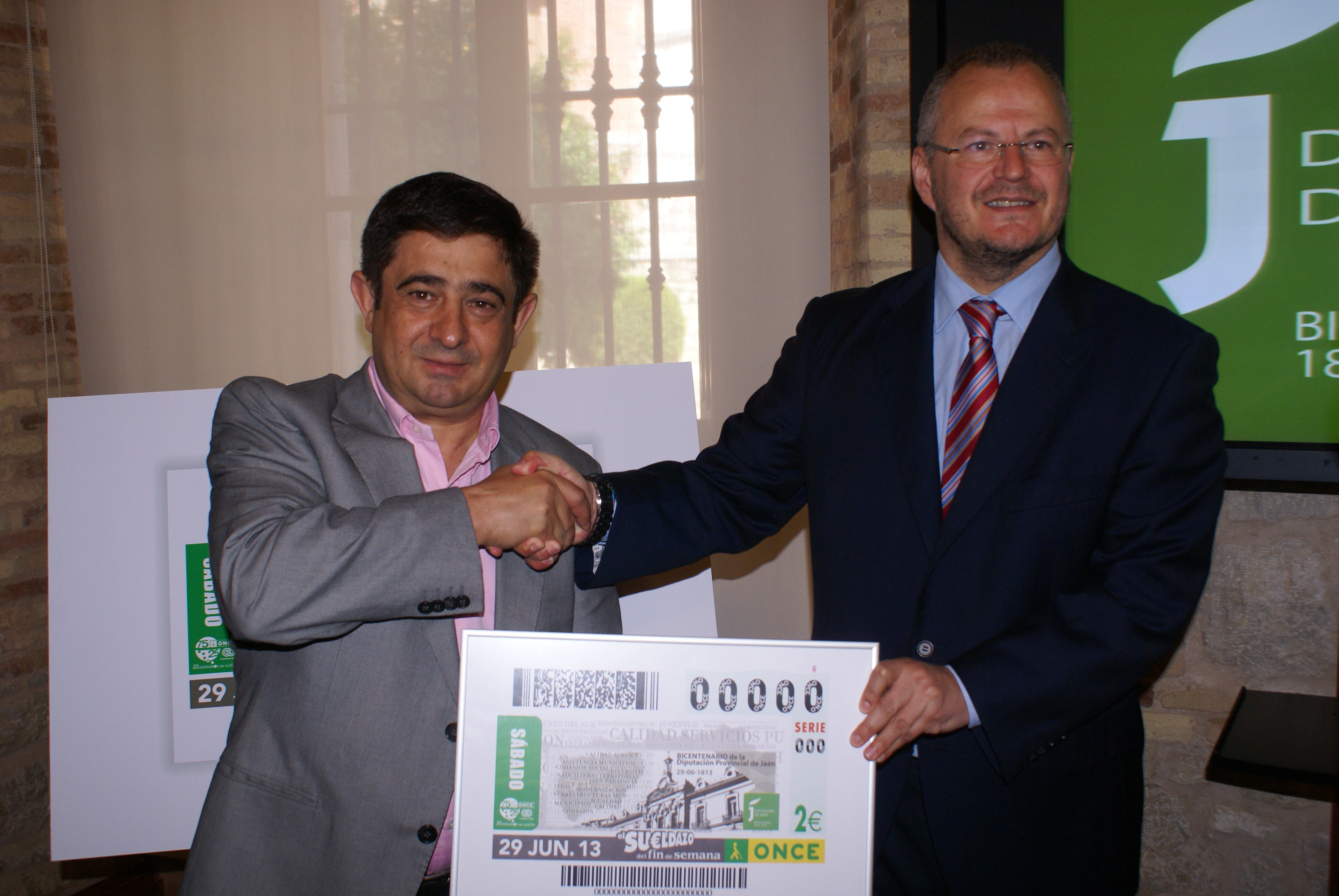 La ONCE dedicó el cupón de fin de semana del sábado 29 de junio al Bicentenario de la Diputación Provincial de Jaén. El presidente de la Diputación, Francisco Reyes, y el delegado territorial de la ONCE en Andalucía, Ceuta y Melilla, Patricio Cárceles, presentaron el viernes 21 la imagen del cupón, junto al director de la ONCE en Jaén, Pascual Gualda.