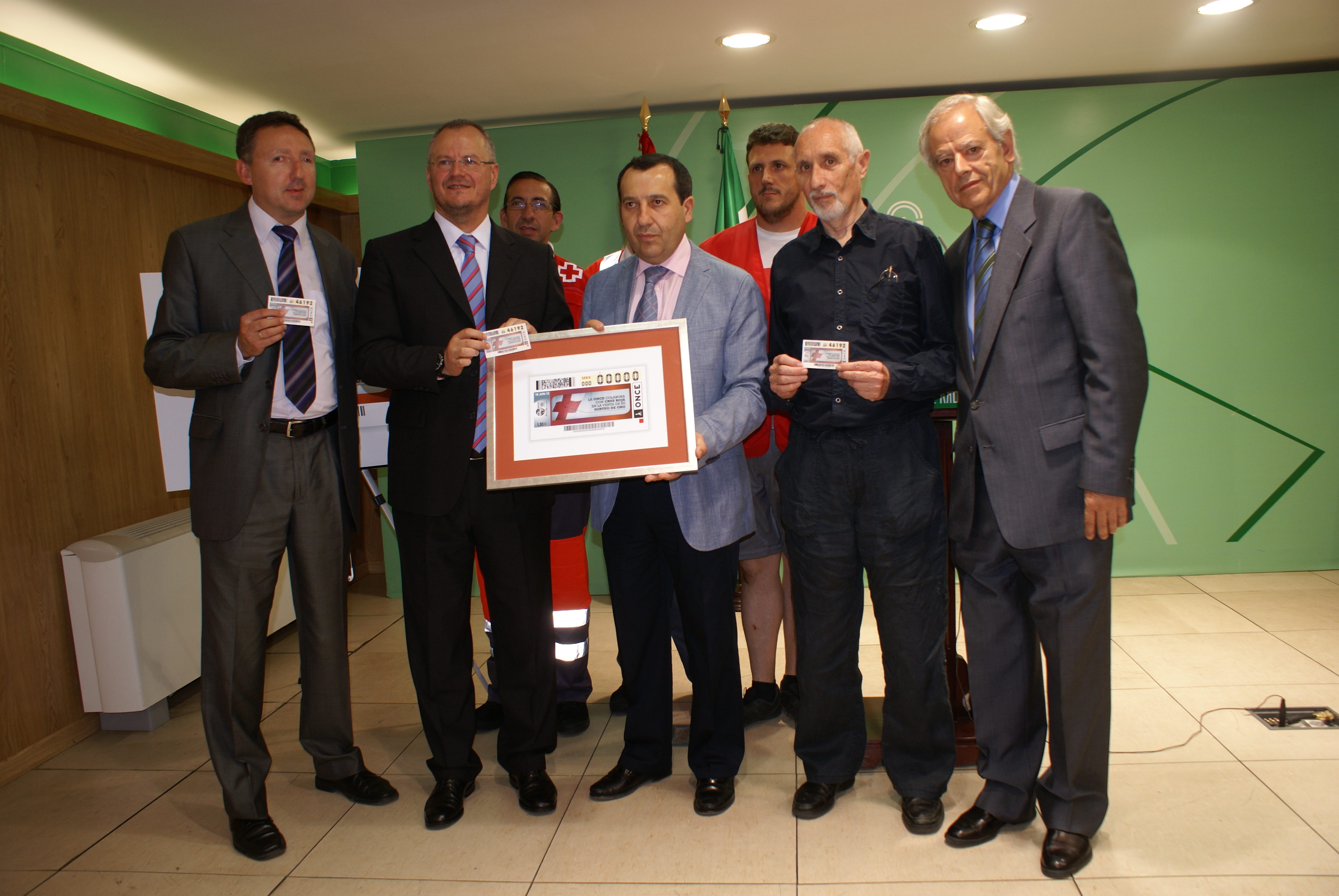 El delegado territorial de la ONCE, Patricio Cárceles, presentó la imagen del cupón dedicado a la Cruz Roja junto al director de la ONCE en Málaga, Cristóbal Martínez, el delegado del gobierno de la Junta en Málaga, José Luis Ruiz, el presidente territorial de Cruz Roja en Málaga, Antonio Morales, el presidente de la Cruz Roja en Andalucía, Javier García-Villoslada, y voluntarios de Cruz Roja.