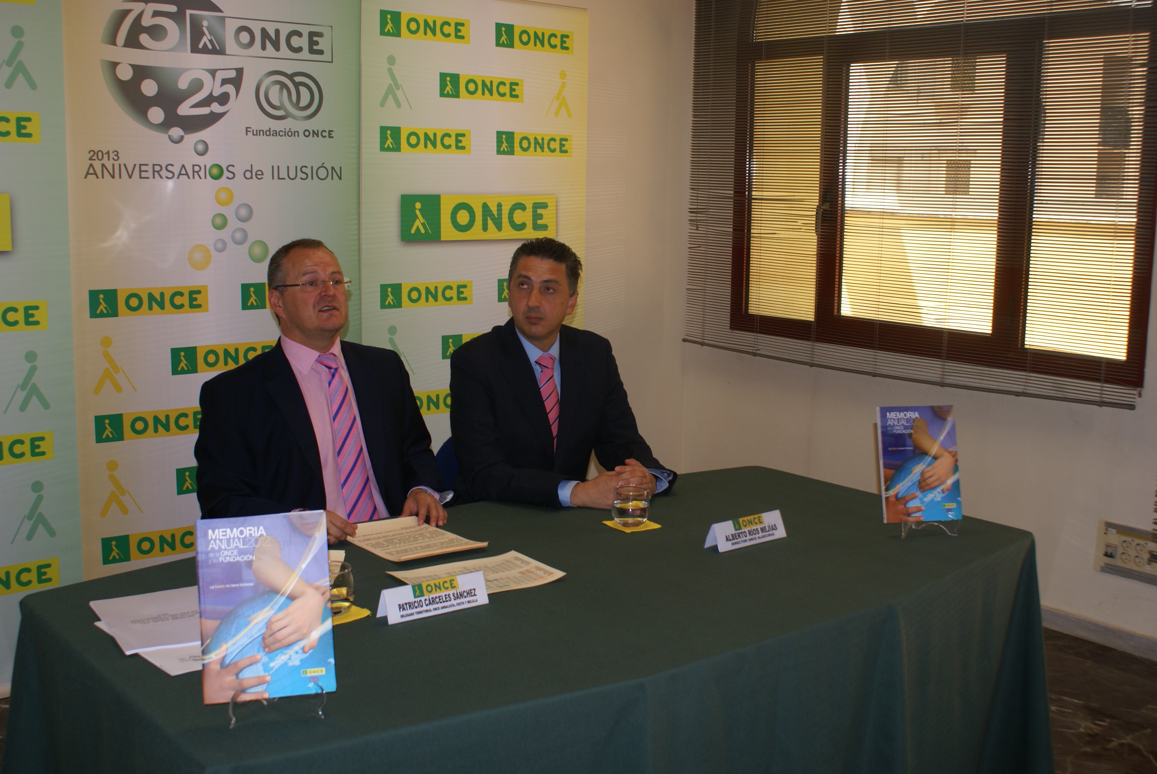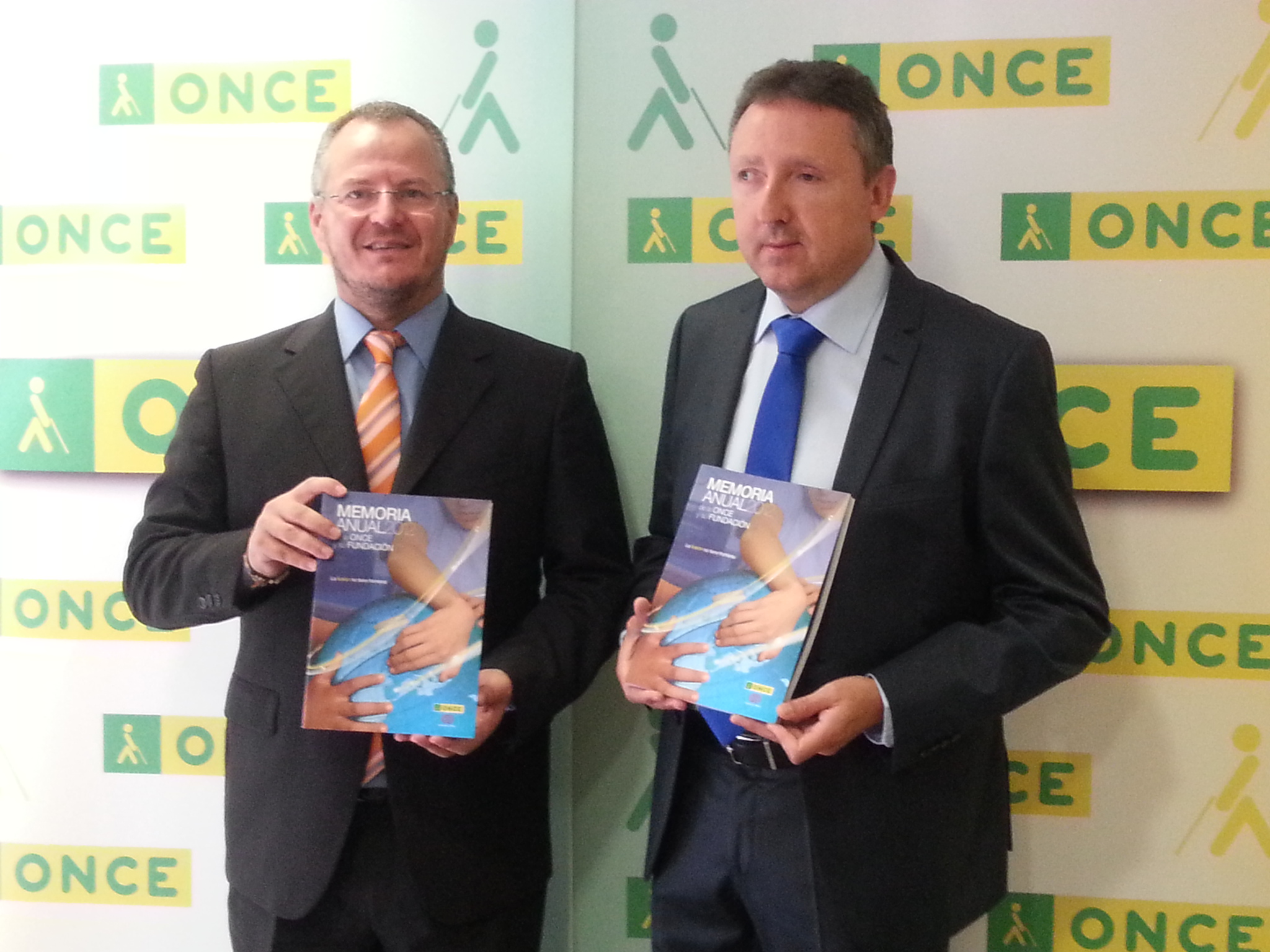 El delegado territorial de la ONCE en Andalucía, Ceuta y Melilla, Patricio Cárceles, junto al subdelegado territorial, Francisco Arroyo, enseñando el libro de la memoria