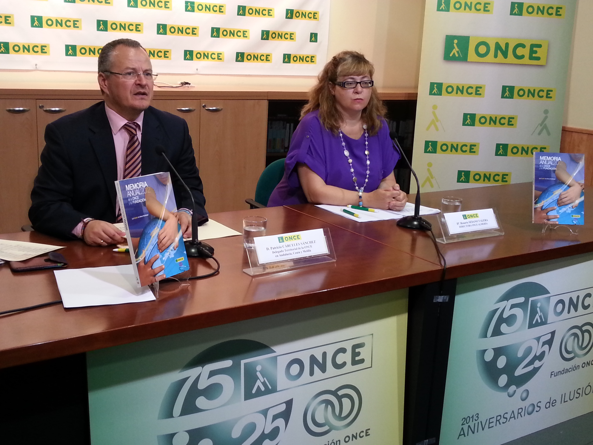 El delegado territorial de la ONCE en Andalucía, Ceuta y Melilla, Patricio Cárceles, junto a la directora de la ONCE Almería, Rosario Sedano, enseñando el libro de la memoria