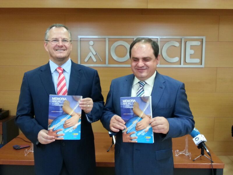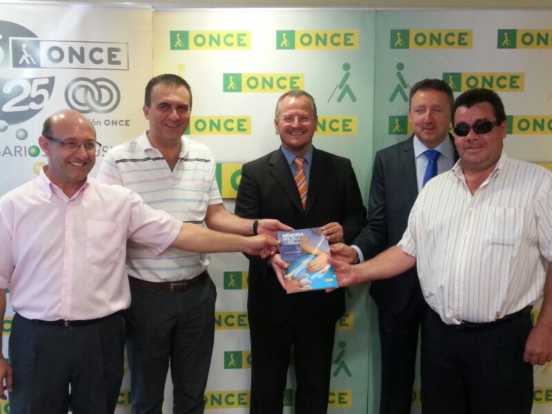 El delegado territorial de la ONCE en Andalucía, Ceuta y Melilla, Patricio Cárceles, junto al director de la ONCE Jaén, Pascual Gualda, enseñando el libro de la memoria