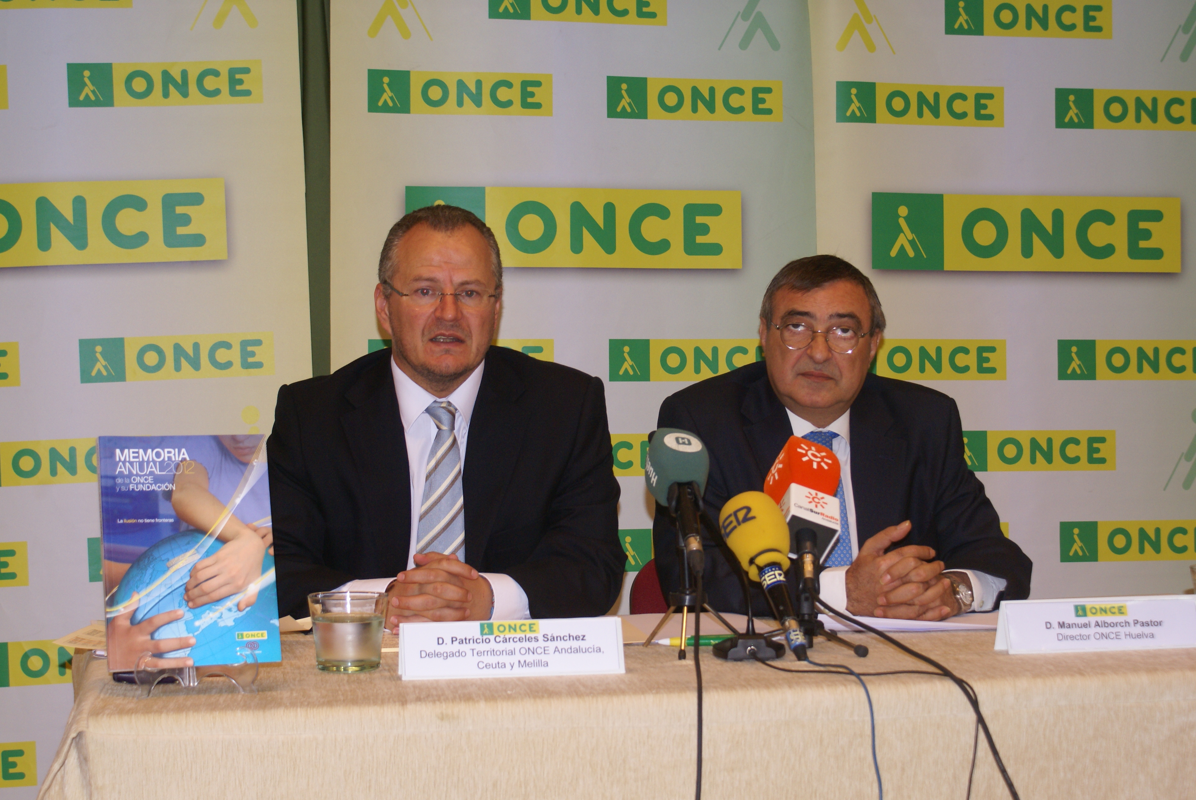 El delegado territorial de la ONCE en Andalucía, Ceuta y Melilla, Patricio Cárceles, junto al director de la ONCE Huelva, Manuel Alborch, enseñando el libro de la memoria