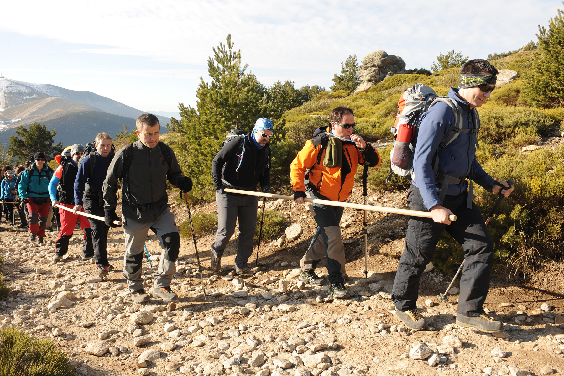 Los deportistas ciegos y deficientes visuales practican la montaña en equipos de tres personas, unidos a una barra direccional, de entre 2,5 y 3 metros de longitud. Un guía vidente encabeza el equipo, seguido de una persona ciega total y completando la tripleta un deportista con deficiencia visual