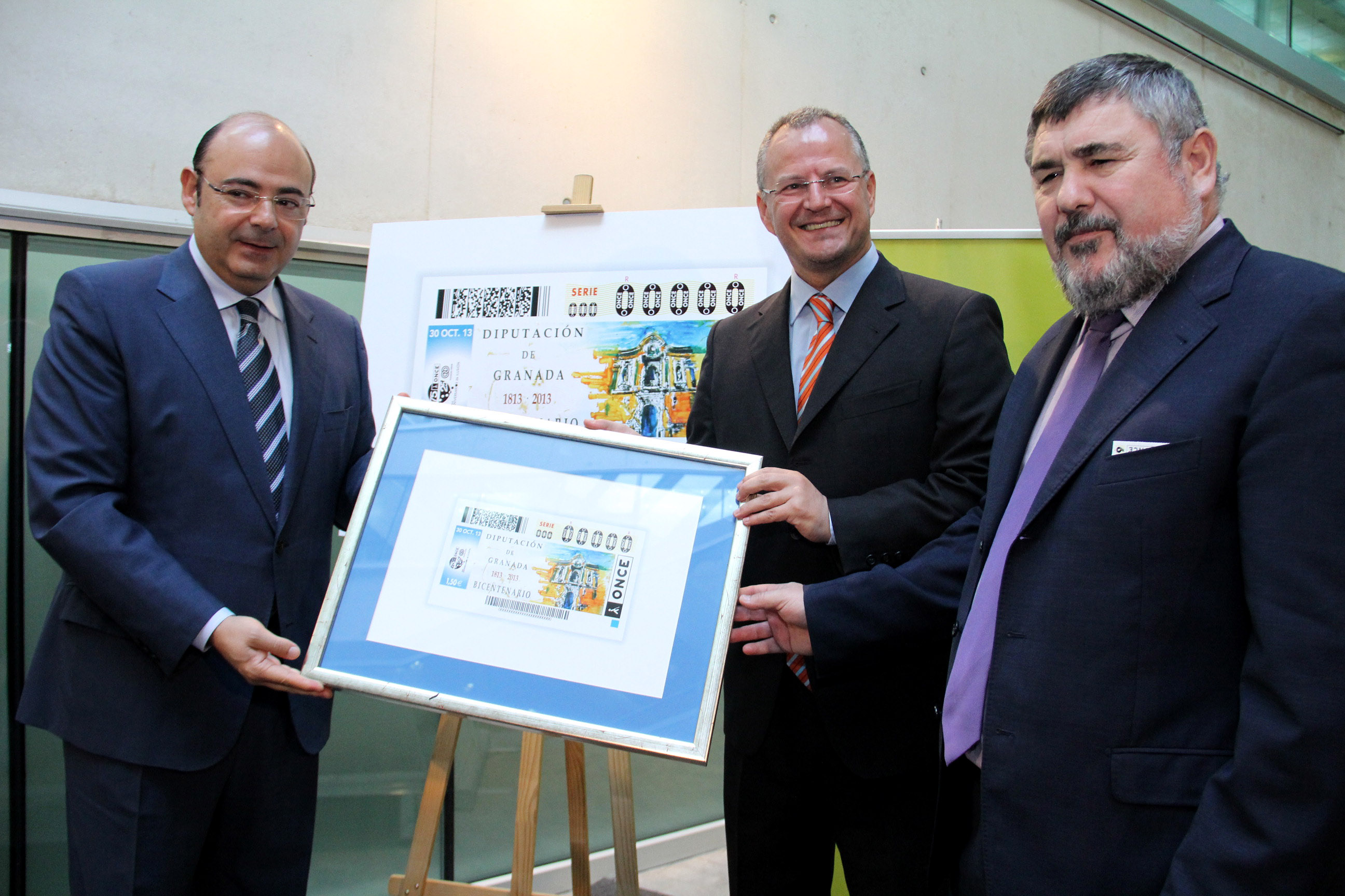 Foto de familia. Patricio Cárceles, Sebastián Pérez, yAlberto Morillas posan con el cupón dedicado a la Diputación de Granada