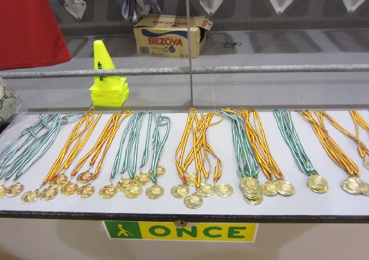 Tras el almuerzo, había que reponer fuerzas, realizaron un concurso de habilidades técnicas, donde los B1 (ciegos totales) participaron en conducción por tiempo desde un cono a otro a unos 5 m. de distancia y tres lanzamientos a portería desde el punto de penalti. Y los B2 conducción por tiempo, lanzamiento y habilidad motriz con el balón.