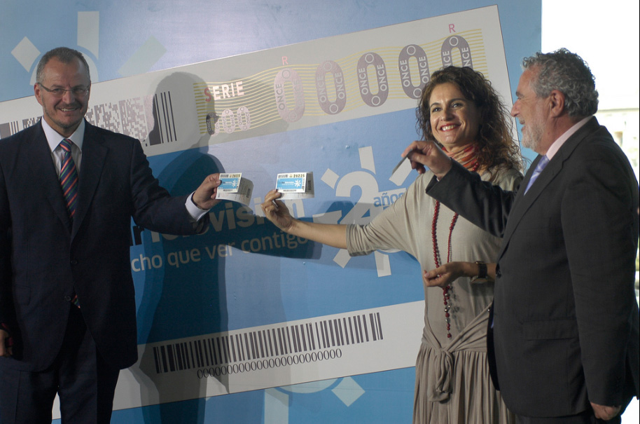 El delegado territorial de la ONCE en Andalucía, Ceuta y Melilla, Patricio Cárceles, el subdirector general de RTVA, Joaquín Durán y la consejera de Hacienda, María Jesús Montero, presentan la imagen del cupón.