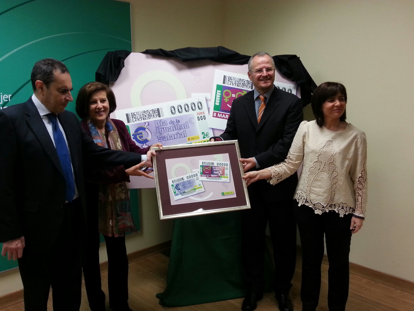 El delegado territorial de la ONCE en Andalucía, Ceuta y Melilla, Patricio Cárceles, el subdirector general de RTVA, Joaquín Durán y la consejera de Hacienda, María Jesús Montero, presentan la imagen del cupón.