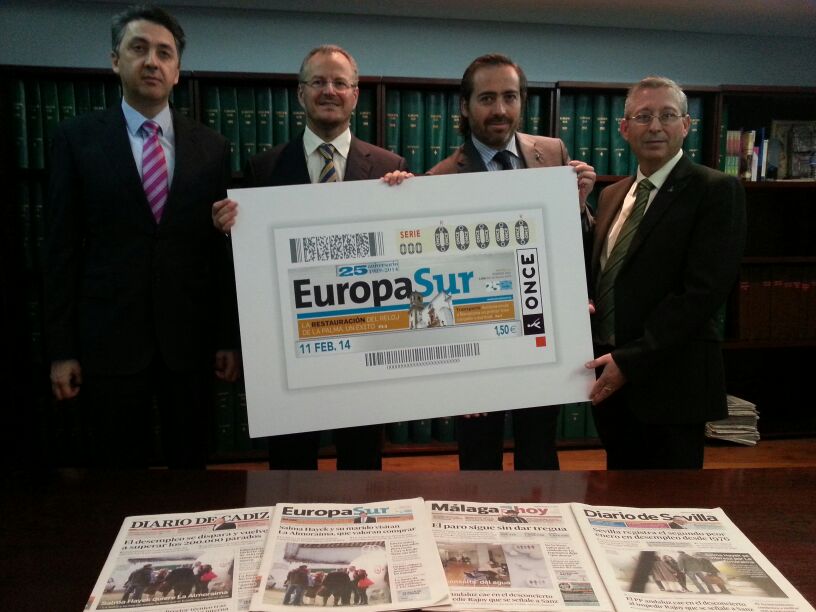 La ONCE dedicó el cupón del martes 11 de febrero al 25 Aniversario de Europa Sur. Al acto de presentación acudieron el delegado territorial de la ONCE en Andalucía, Ceuta y Melilla, Patricio Cárceles, el director de zona de la Organización, José Antonio Toledo, y el director de la ONCE en Algeciras, Alberto Ríos, los cuales entregaron la plancha que ha dado origen al cupón a Alberto Grimaldi, director de Europa sur.