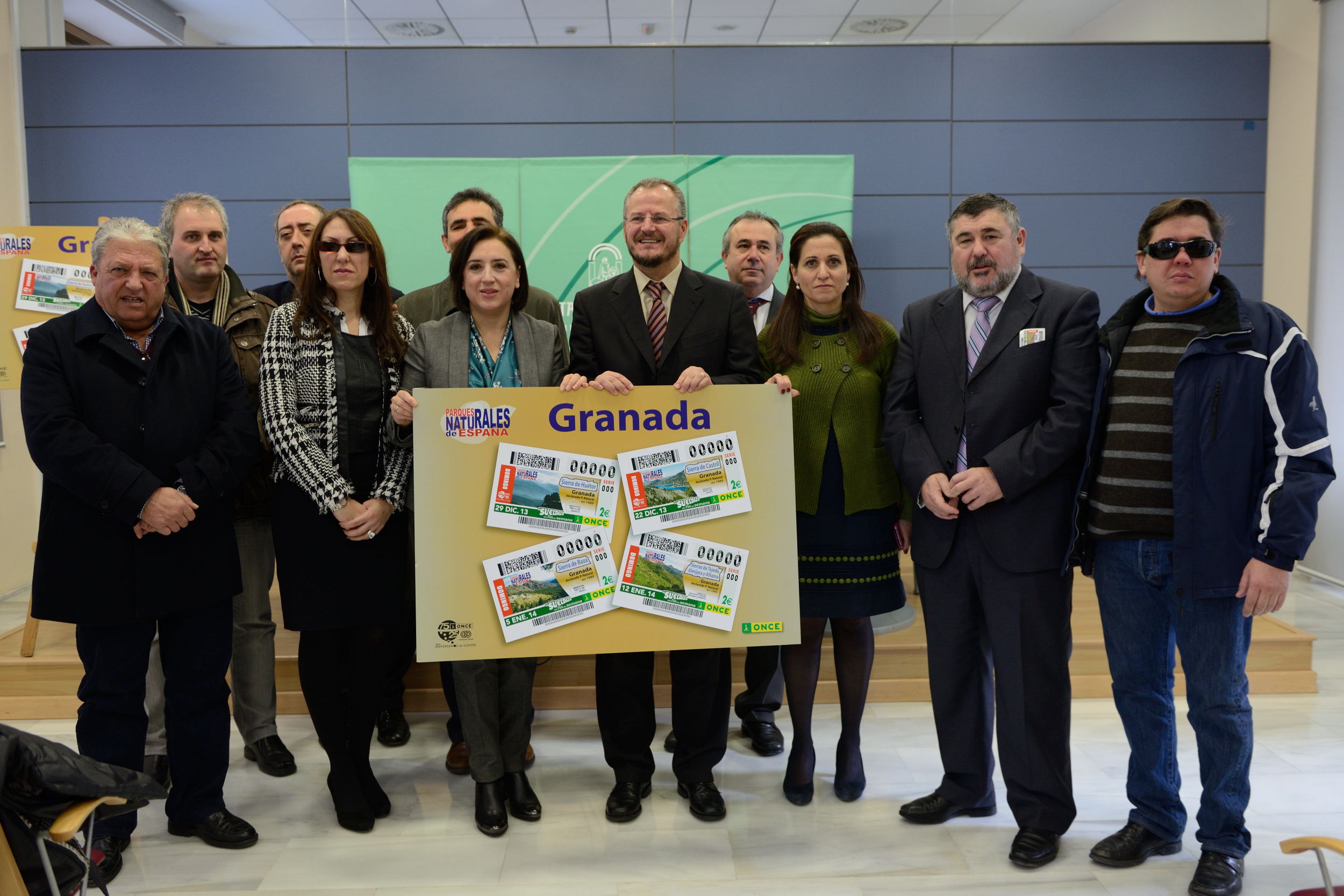 Representantes de la ONCE de Granada y Andalucía, muestran la imagen de los cupones dedicados a las Sierras de Granada.