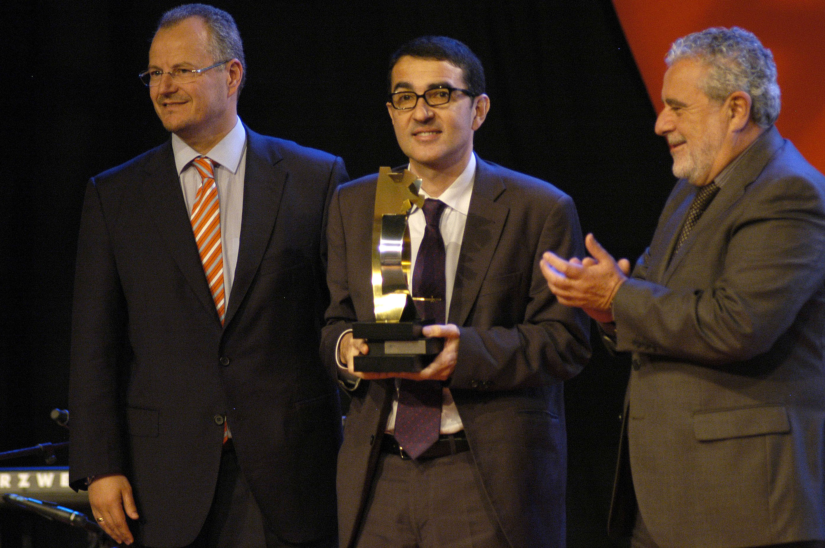 El delegado territorial de la ONCE en Andalucía, Ceuta y Melilla, Patricio Cárceles, el vicepresidente primero del Consejo General de la ONCE, Andrés Ramos y el subdirector general de RTVA, en el momento de la entrega del premio Público. Reportaje fotográfico: Miguel Ángel de León