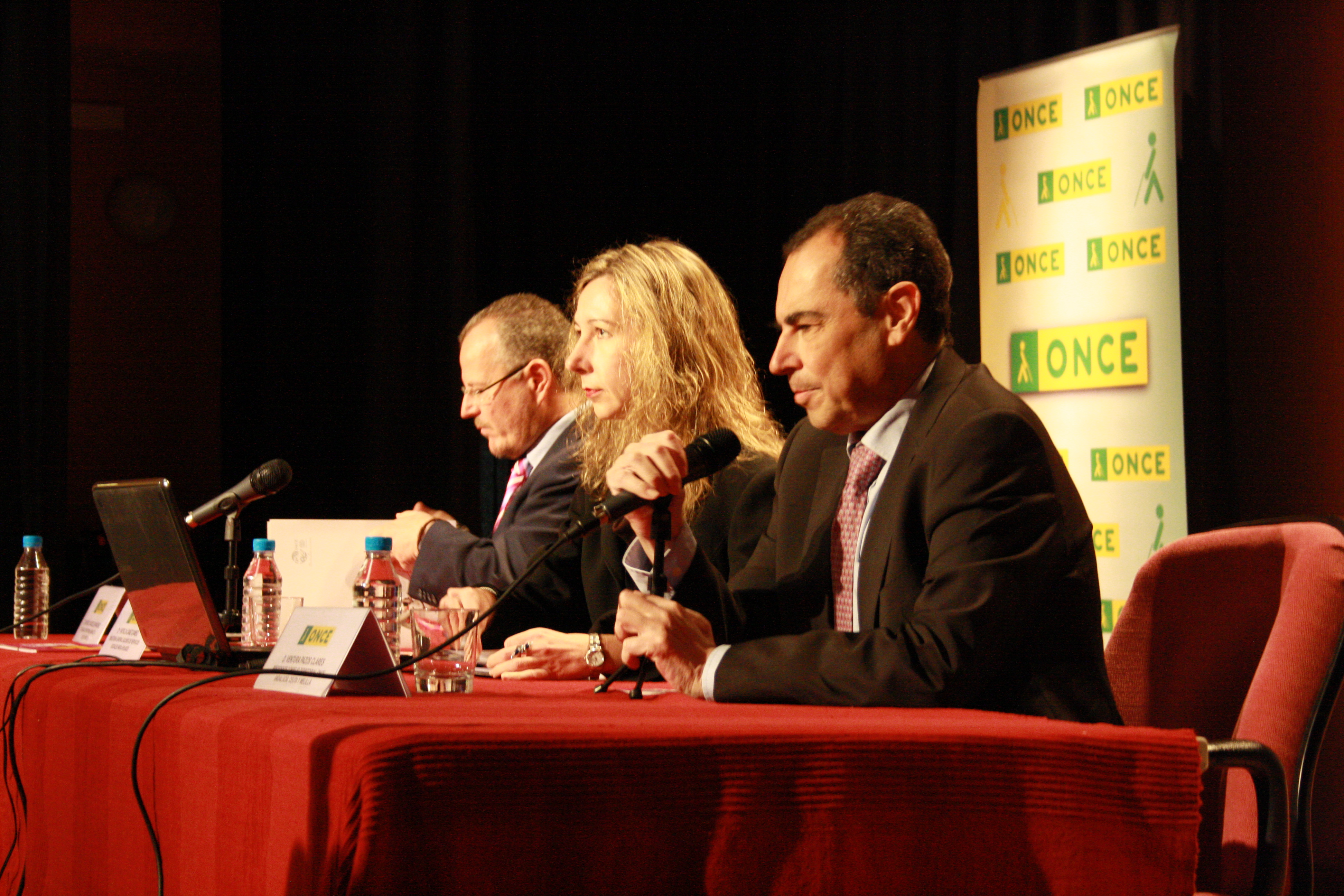 La directora general adjunta de Servicios Sociales para Afiliados de la ONCE, Patricia Sanz, el delegado territorial ONCE en Andalucía, Ceuta y Melilla, Patricio Cárceles, y el presidente del Consejo Territorial, Ventura Pazos