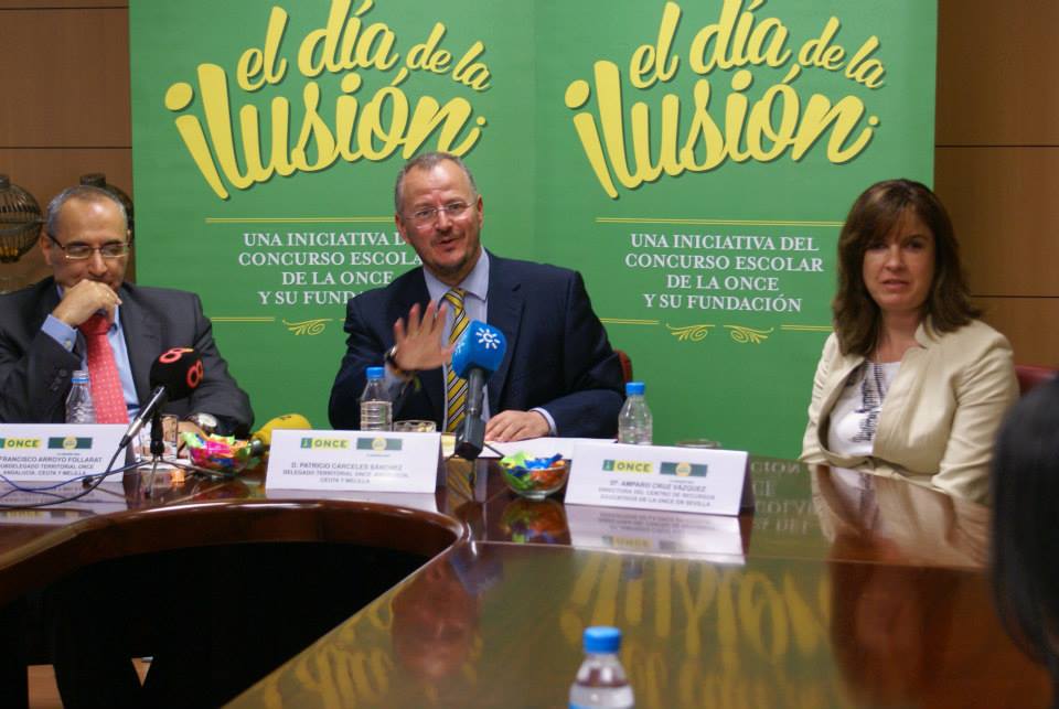 El delegado y el subdelegado territorial de la ONCE en Andalucía, Ceuta y Melilla, Patricio Cárceles y Francisco Arroyo, junto con la directora del CRE, Amparo Cruz, en la rueda de prensa del Día de la Ilusión