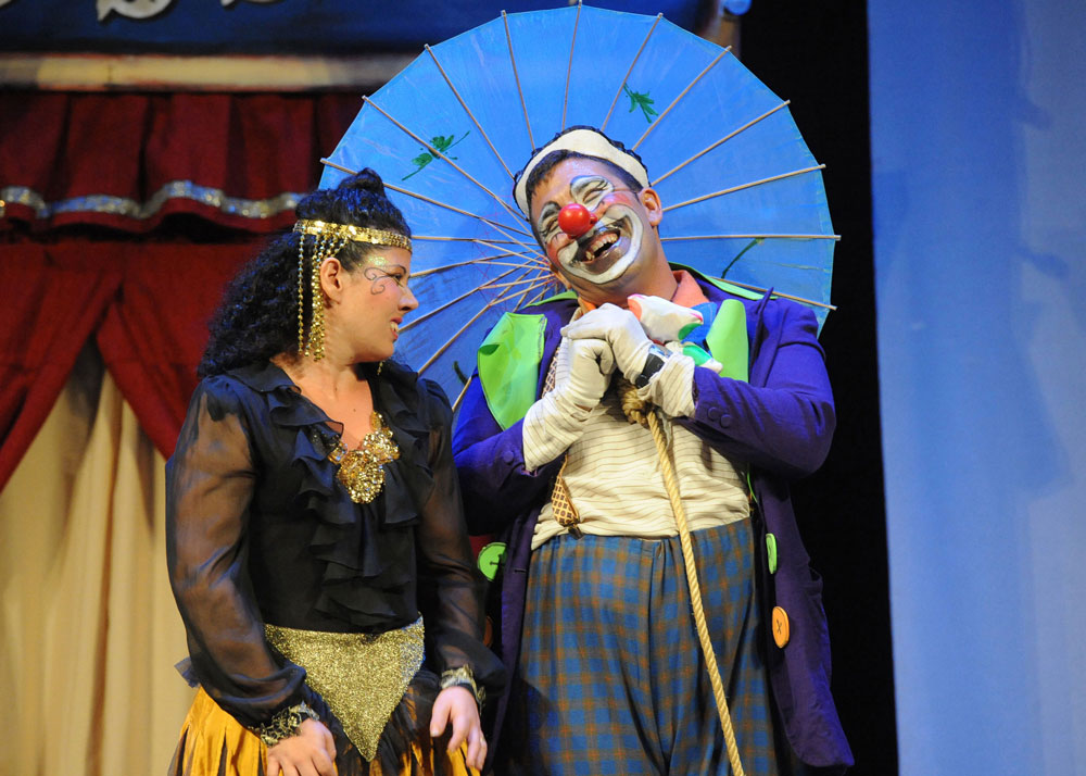 Actores de ‘Cuarta Pared’, ataviados con vestuario circense, actuando en una escena de su obra ‘El circo más triste del mundo’