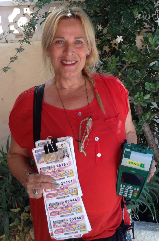 María Valdivia Úbeda, vendedora de la ONCE en la barriada de El Zapillo (Almería) desde hace dos años y medio: “Todavía no me lo creo. No he pegado ojo en toda la noche, porque he alegrado la vida de gente que están sin nada. Me siento contentísima” – y añadía – “Los clientes me dan la vida, ellos con sus bromas y yo con las mías”. Estas fueron las palabras de María cuando su hijo le comunicó que había repartido un total de 1.680.000 euros en la capital almeriense, entre un acertante del Zapillo, ganador del Sueldazo de 300.000 euros al contado y 5.000 euros al mes durante 20 años; mas otros nueve acertantes agraciados con 20.000 euros cada uno.