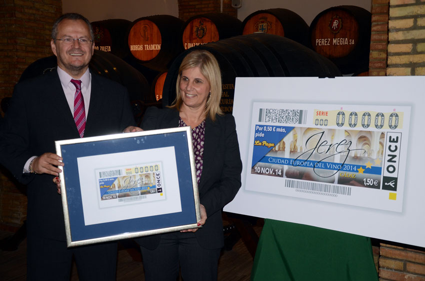 La alcaldesa de Jerez, María José García Pelayo, presidió la presentación del cupón en el que participaron Antonio Real, Antonio Montero y Beltrán Domecq, por parte del Consejo Regulador, y Patricio Cárceles en representación de la ONCE en Andalucía junto a los directores de la ONCE en Cádiz y Jerez, José Antonio Toledo y Jaime Hernández, respectivamente.