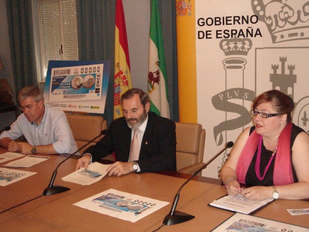 El subdelegado del Gobierno en Huelva, Enrique Pérez, junto al director de la ONCE en Huelva, Manuel Alborch, durante la presentación del cupón de la moneda de la ciudad
