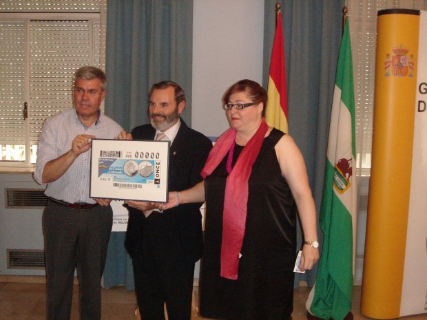 Entrega de la reproducción del cupón al subdelegado del Gobierno en Jaén, Juan Bautista Lillo, y al alcalde de la ciudad, José Enrique Fernández de Moya, por parte de la directora provincial de la ONCE, Charo Sedano