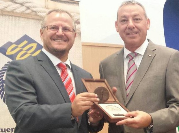 Patricio Cárceles hizo también entrega al presidente del puerto, Álvarez de la Chica, de una medalla conmemorativa del aniversario