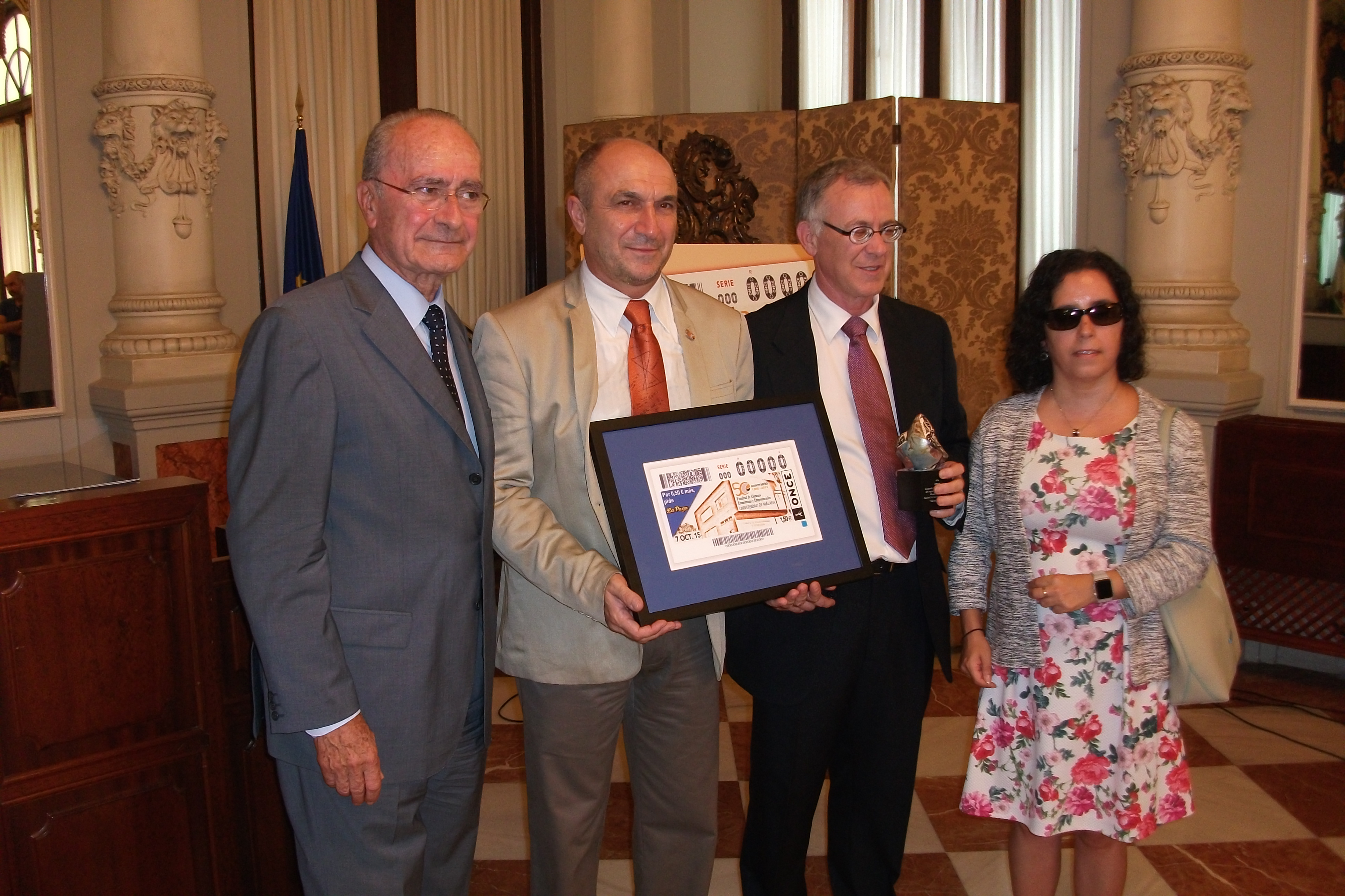 El director de la ONCE en Málaga, José Miguel Luque, y la presidenta del Consejo Territorial de la ONCE en Andalucía, Ceuta y Melilla, Isabel Viruet, entregaron la imagen del cupón al decano de la Facultad, Eugenio José Luque, en un acto que presidió el acalde de la ciudad, Francisco de la Torre.