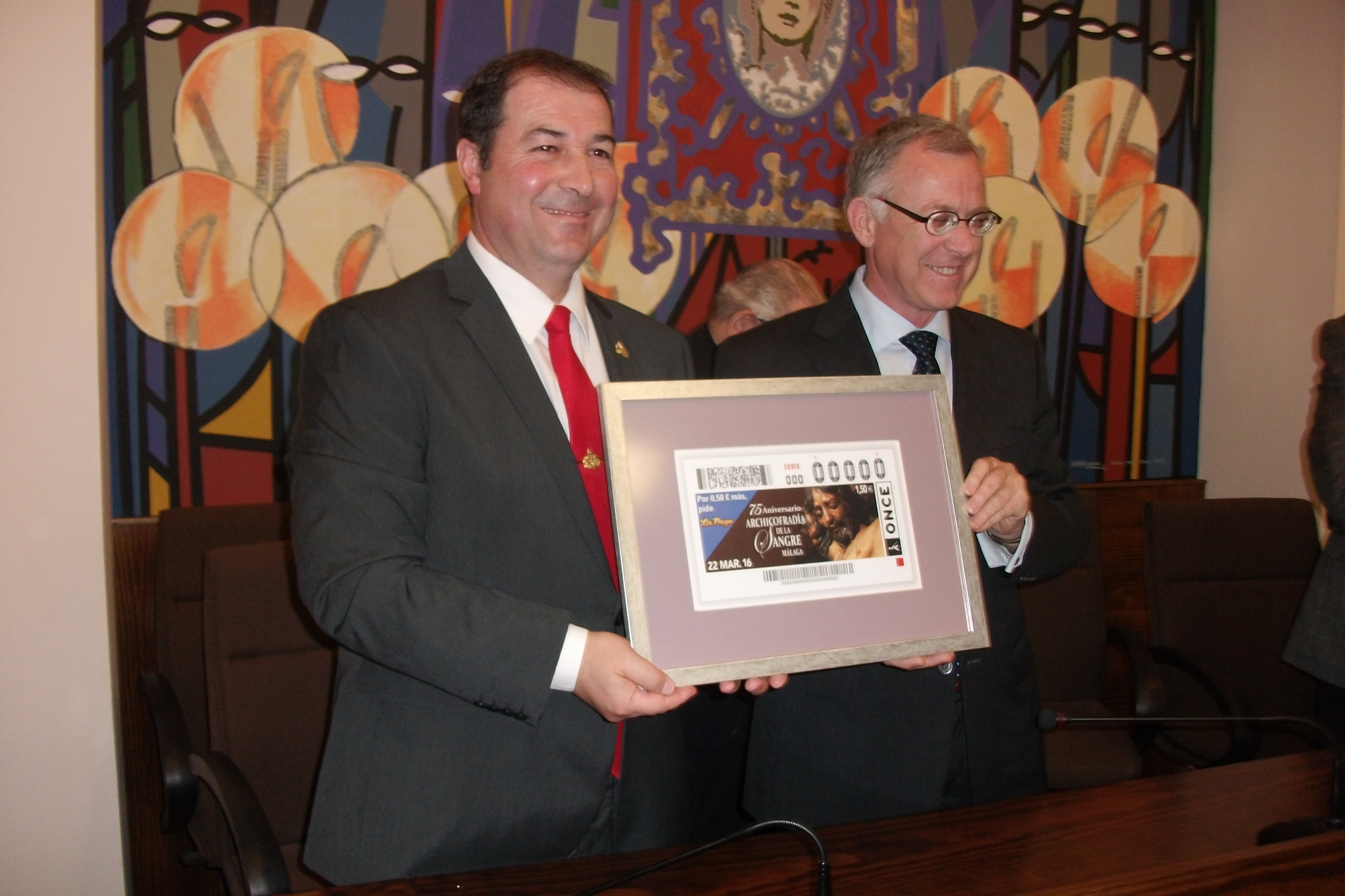 El director de la ONCE en Málaga y el hermano mayor de la Archicofradía de la Sangre presentando la imagen del cupón