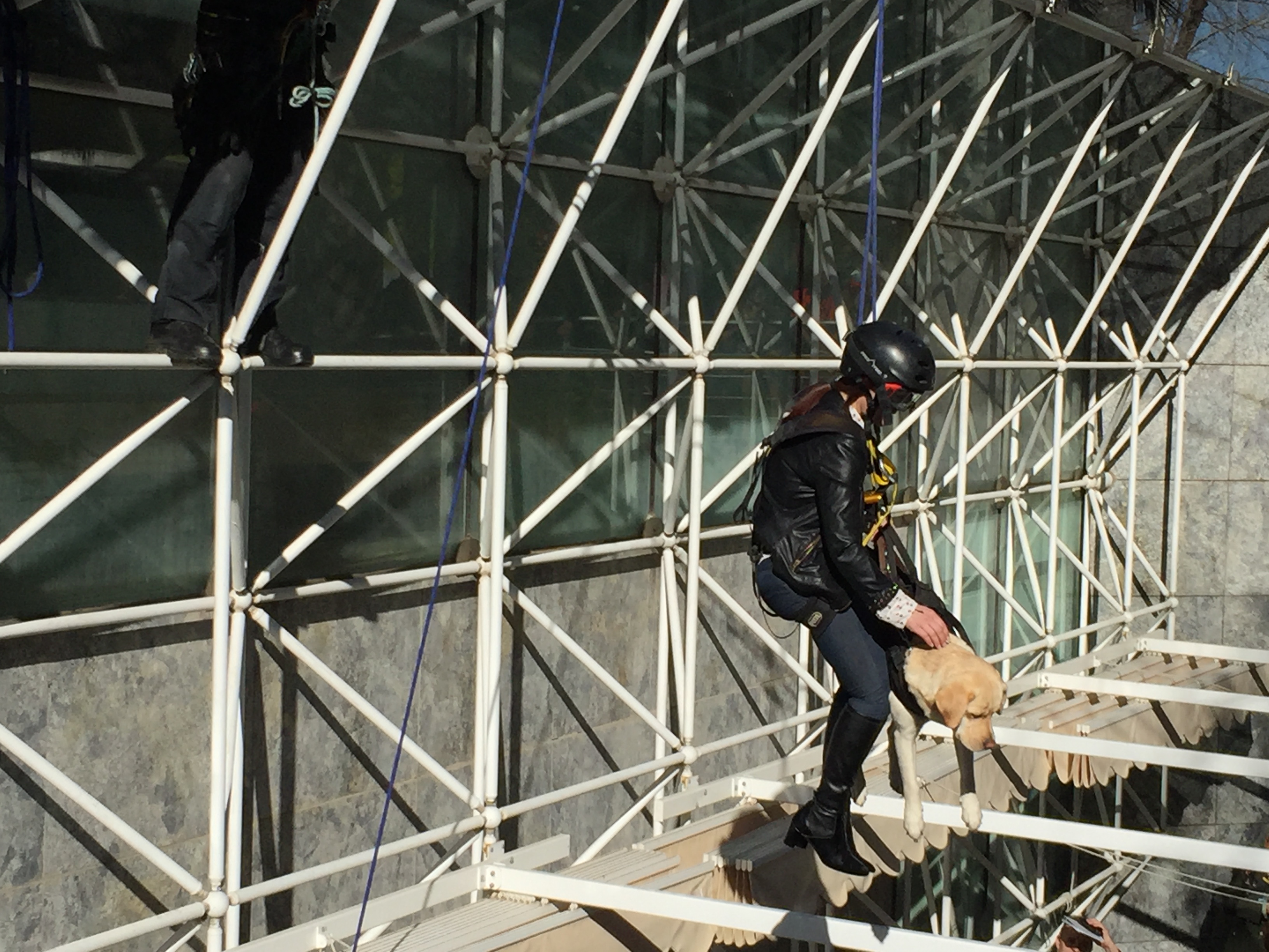 Once personas ciegas afrontaron distintas situaciones de pánico y de rescate en distintas dependencias, incluida una usuaria con su perro guía que fue transportada por los aires a través de poleas desde el patio de la terraza del edificio a la calle.