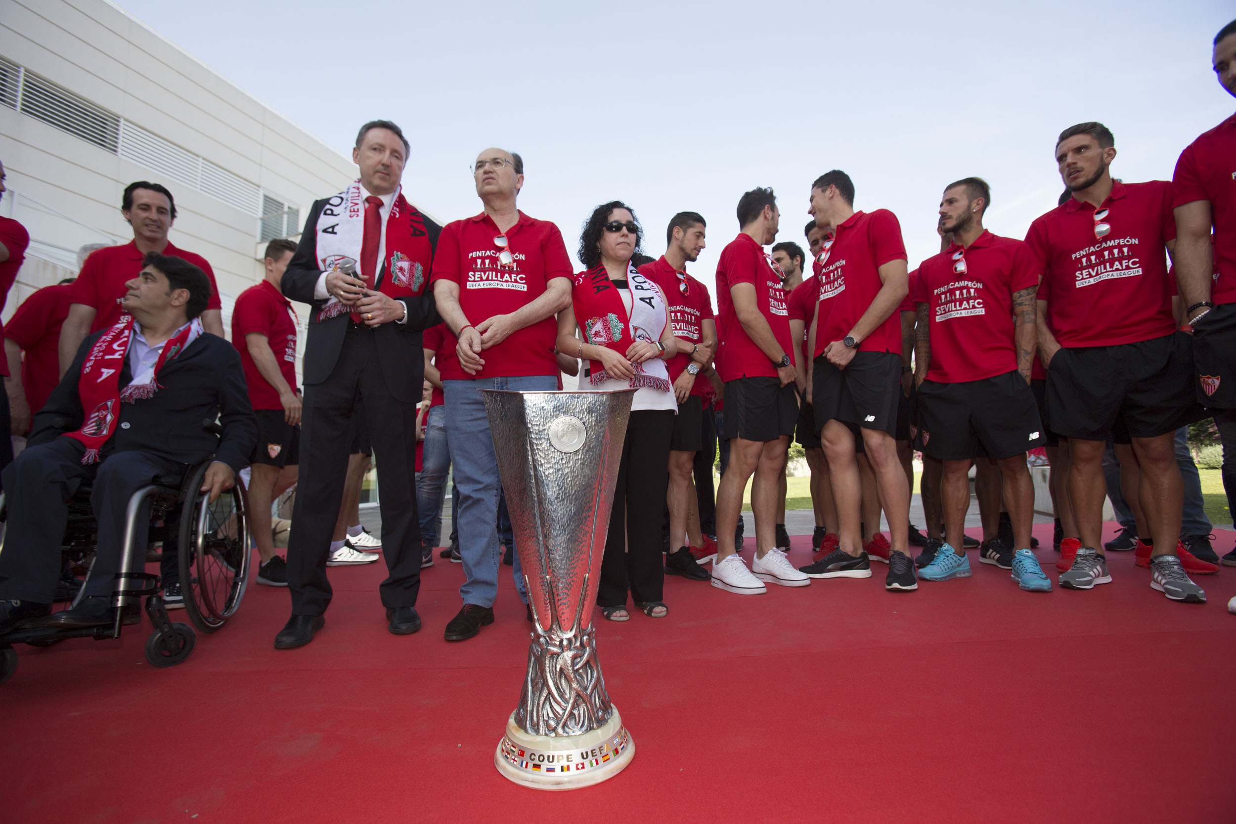Por su parte, José Castro, dijo que la presencia del Sevilla F.C. en la sede del CRE era “un compromiso cumplido” porque ya lo había ofrecido con la Súpercopa el pasado agosto y no pudo ser por el triunfo del Barça. Cerca de un millar de personas, entre afiliados, trabajadores y pensionistas de la ONCE vistieron del amarillo de la ilusión el patio del CRE ya que la mayoría portaba globos amarillos para recibir a sus ídolos. A partir de ahí, ya en autobús descapotable, los de Emeri recorrieron las calles de Sevilla en medio de un delirio generalizado que explotó ya por la noche en el estadio Ramón Sánchez Pizjuán con una puesta en escena auténticamente espectacular.