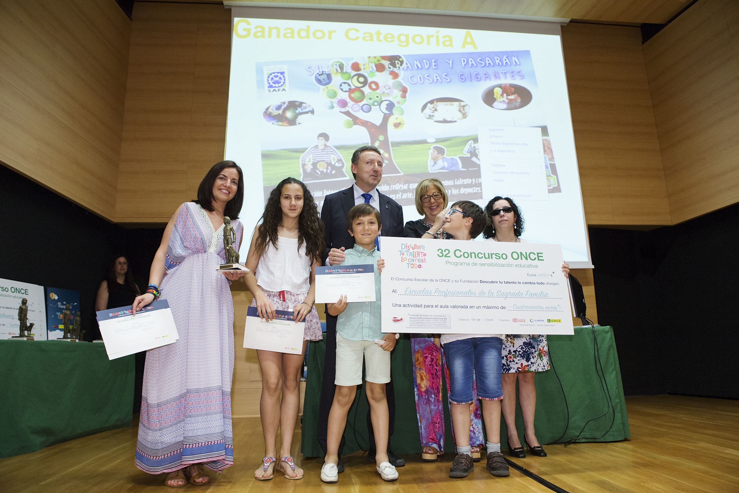Profesores del colegio San José de Calasanz de Sevilla recibiendo el premio del Concurso Escolar de la ONCE y su Fundación