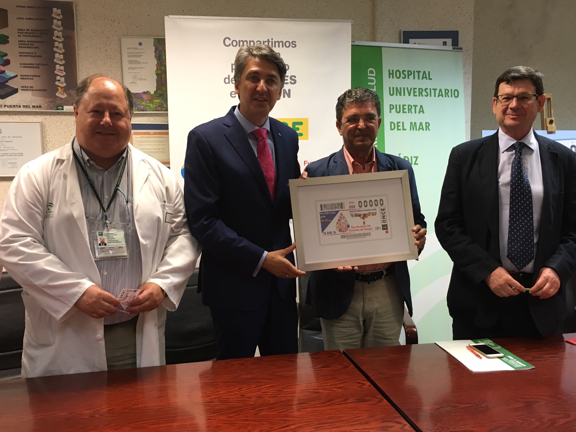 El director de la ONCE en Cádiz, Alberto Ríos, y el delegado territorial de Igualdad, Salud y Políticas Sociales de la Junta de Andalucía en Cádiz, Manuel Herrera, han presentaron el cupón en el Hospital Univeristario Puerta del Mar en un acto en el que participaron el director del Centro Regional de Transfusión Sanguínea en la provincia, Antonio Salat, y el director gerente del centro hospitalario, Rafael Pereiro.