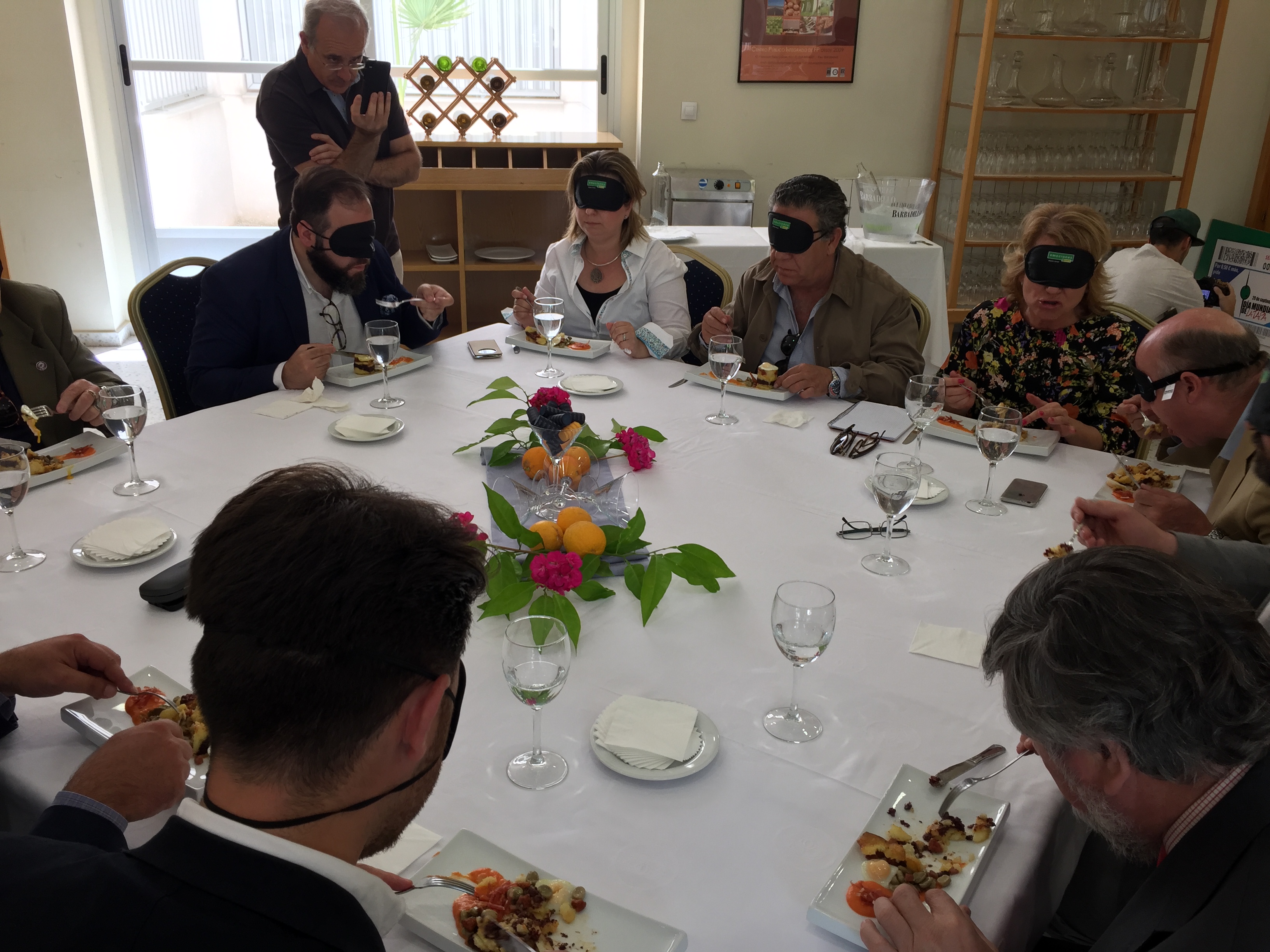 El consejero de Turismo y Deporte con el antifaz tomando tapas a ciegas en el Día Mundial de la Tapa