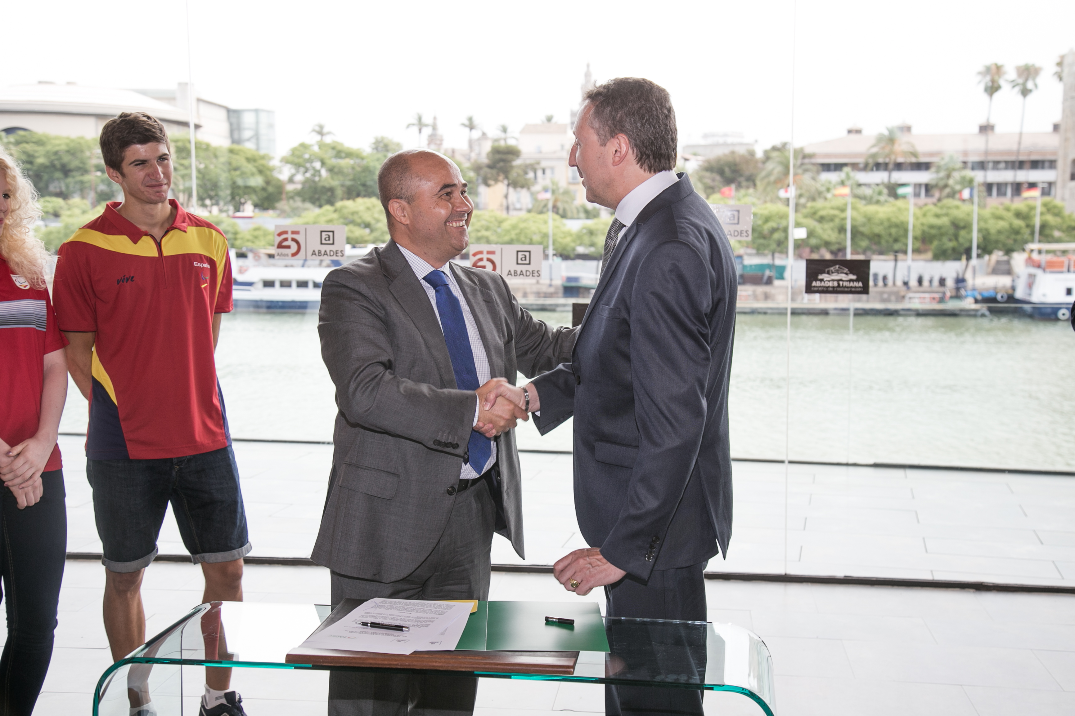 El presidente de la FADEC y delegado territorial de la ONCE en Andalucía, Ceuta y Melilla, Cristóbal Martínez, y el director general adjunto del Grupo Abades, Antonio Martín, firmaron el convenio de colaboración en presencia de tres de los paralímpicos andaluces preseleccionados para Río, y el vicepresidente de la FADEC y subdelegado territorial de la ONCE, José Antonio Toledo.