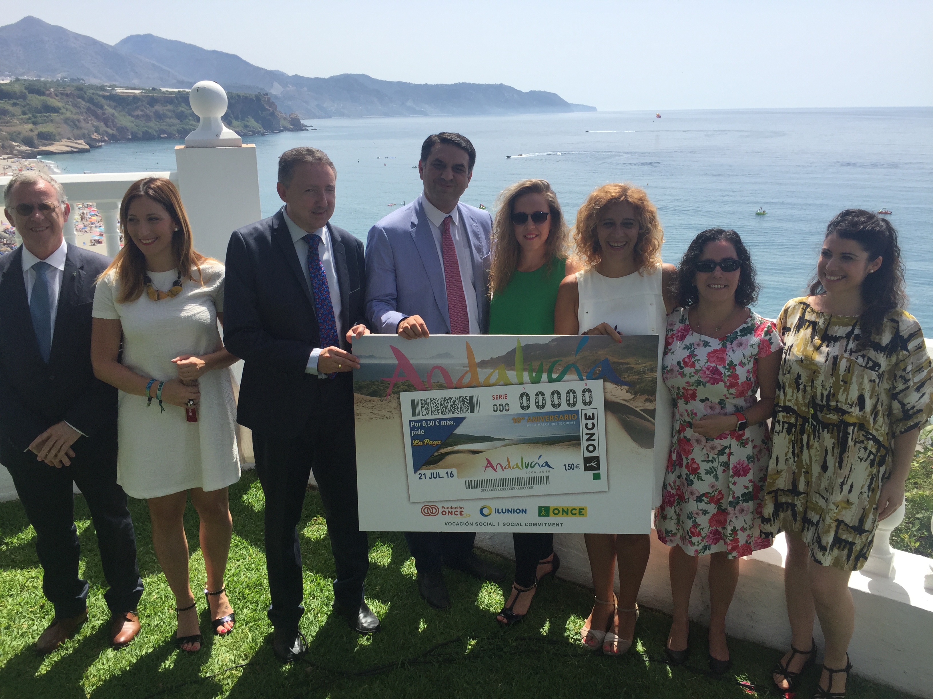El consejero de Turismo y Deportes y la alcaldesa de Nerja, Rosa Arrabal, junto al delegado territorial de la ONCE en Andalucía, Ceuta y Melilla, Cristóbal Martínez, y la presidenta del Consejo Territorial, Isabel Viruet, presentaron el pasado 11 de julio, frente al Mediterráneo de uno de los balcones de Nerja, la imagen del cupón con el que la ONCE se sumó a estos diez años de marca única de Andalucía como destino turístico.