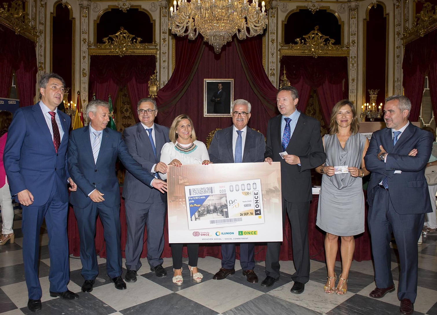 El vicepresidente y consejero de la Presidencia y Administración Local de la Junta de Andalucía, Manuel Jiménez Barrios, la presidenta de la Diputación de Cádiz, Irene García, el director de la SER en Andalucía, Antonio Yélamo, la directora de Radio Cádiz, Lourdes Acosta, el delegado territorial de la ONCE en Andalucía, Ceuta y Melilla, Cristóbal Martínez, junto a toda la plantilla de profesionales de Radio Cádiz, directivos de la ONCE y representantes del ámbito institucional y social de la ciudad y la provincia llenaron el Salón Regio de la Diputación Provincial, una sala del siglo XVIII al mejor estilo de Versalles, que sirvió de escenario de lujo para presentar el cupón del sorteo de la ONCE del sorteo del pasado 26 de septiembre dedicado a los 90 años de Radio Cádiz.