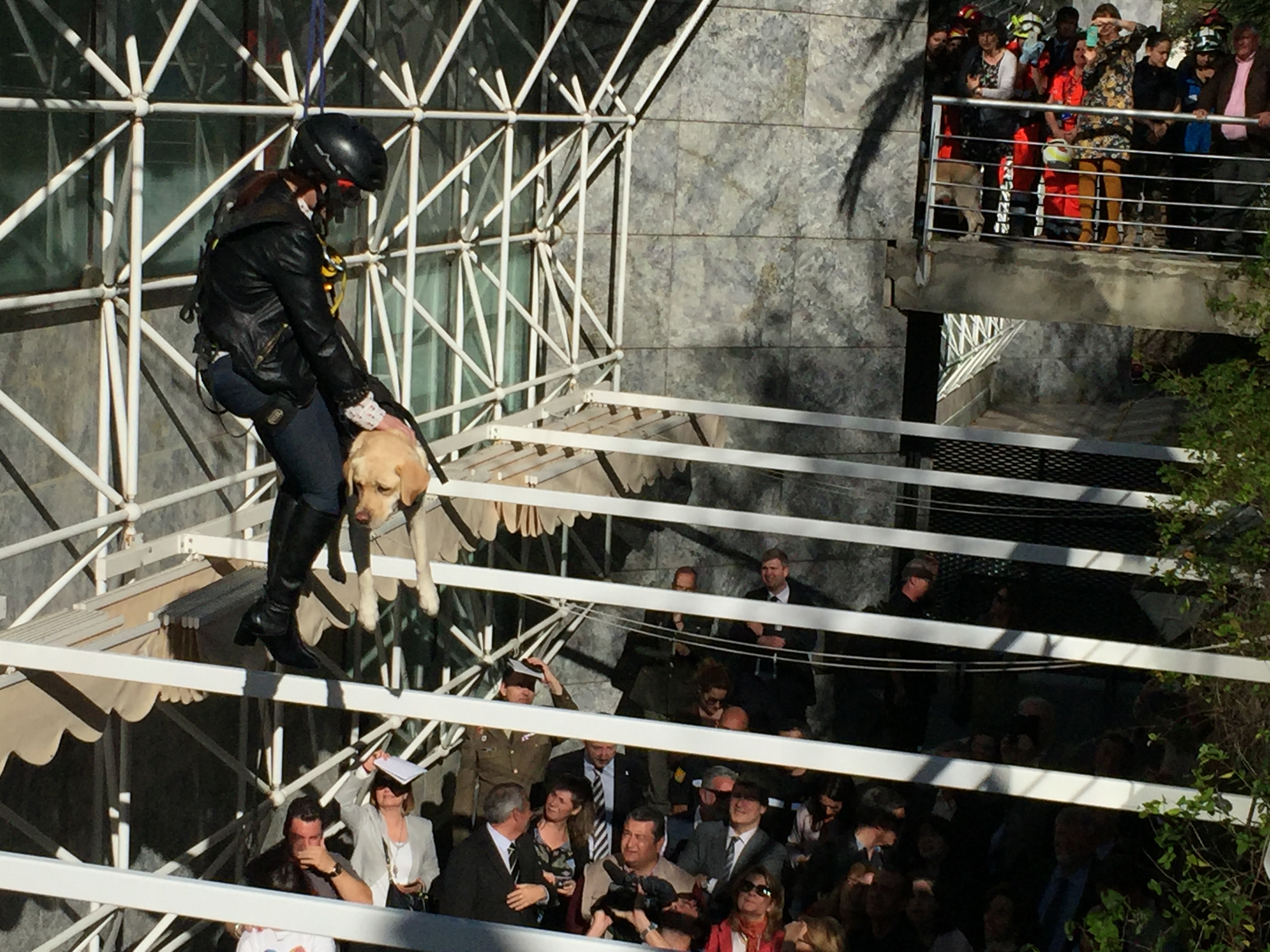 Simulacro del transporte con polea de personas ciegas con perros guías