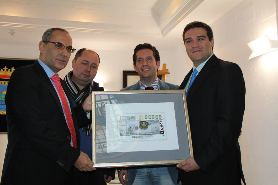 El alcalde de Sanlúcar la Mayor, Antonio Manuel Pérez y el subdelegado territorial de la ONCE en Andalucía, Ceuta y Melilla, Francisco Arroyo, presentaron el pasado 23 de enero en el Ayuntamiento, la imagen del cupón que lleva de fondo partituras e instrumentos musicales con el estandarte de la Banda de Nuestra Señora del Rosario. Al acto asistió también su presidente, Francisco Álvarez.